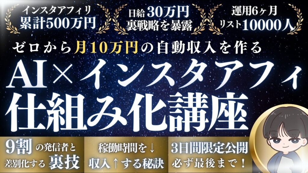 AI×インスタアフィリエイト×仕組み化で「月10万円の半自動収入」を作り、独立を目指す特別講座です。冒頭動画で人生の安定を手に入れる仕組み化の概要を解説しているので、ぜひご覧ください!